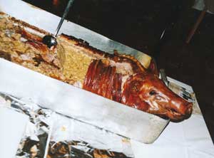 Ein ganzes Spanferkel wird von allen Knochen ausgelöst, nach einem alten Hausrezept mit einer Semmelfülle gefüllt und ergibt so nach einer Bratzeit von sechs Stunden eine knusprige, unvergeßliche Spezialität.
